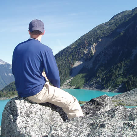 alt="hiking into an alpine lake" />